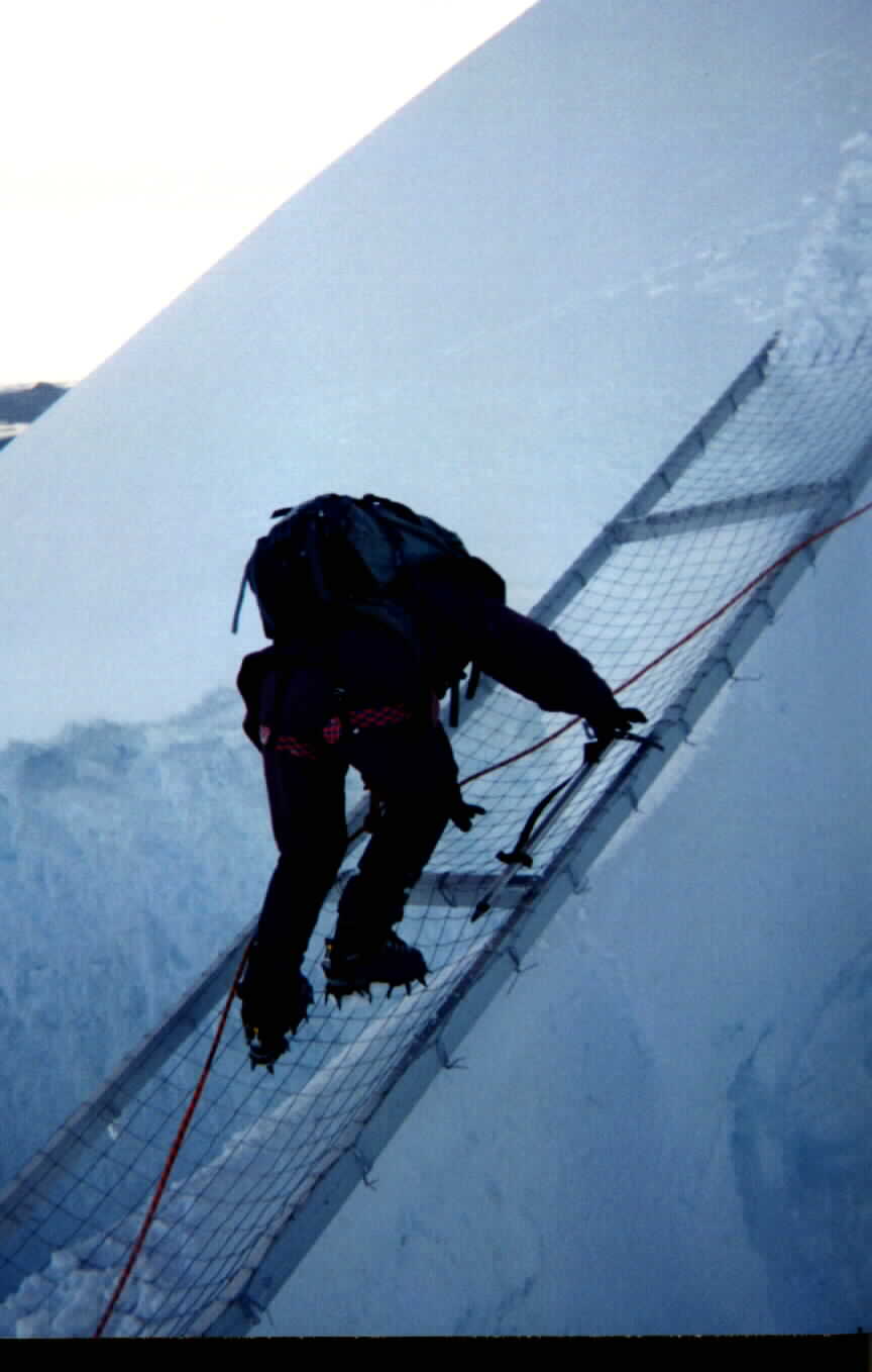Judy crossing the crevasse on a scary aluminium bridge