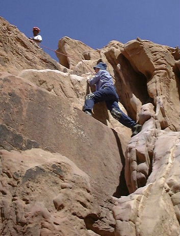 If you're hoping for descriptions of hard rock routes, sorry, but that wasn't our reason for being there. Another time, perhaps (in my dreams). We just scrambled (on separate days) up the Burdah Rock Bridge and Jebel Rum itself, by their easiest routes.