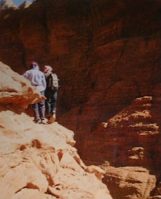 This is an amazing, er, rock bridge, high above the desert floor a few miles south-east of Rum. Attayak called in at a canyon on the way, ostensibly to show us some old carvings and the interesting water-worn bowls, but I think really to see whether these two geriatrics who'd hired him were up to the Burdah route. We also called in at a much smaller rock bridge, which we easily scrambled up to, and from which Attayak found it necessary to go and "rescue" a German girl he'd taken a shine to.
