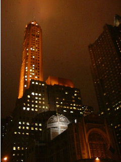 Looking into the evening gloom from Fifth Avenue, towards the Citicorp building with its distinctive sloping roof
