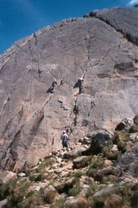 The perfect slab of Little Tryfan, and Steve belaying Judy | ||
