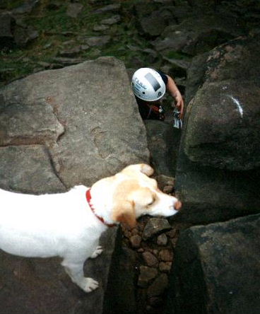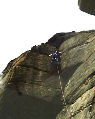 Layback above a small roof is airy, but has good holds, with an excellent exit into cave (should post to uk.rec.caving). I clipped rather unsportingly into Mark's previous top-belay setup to protect my exit, so with the half-fall it barely counts as a true lead.