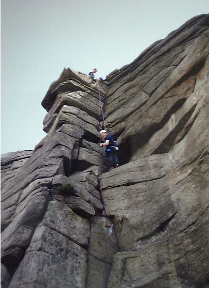 Ant belayed me, and Lewis unselfishly soloed alongside me on this, my first gritstone lead, to show me how to protect it, and also helped set up the top-belay. Ant will have been equally grateful for that!
