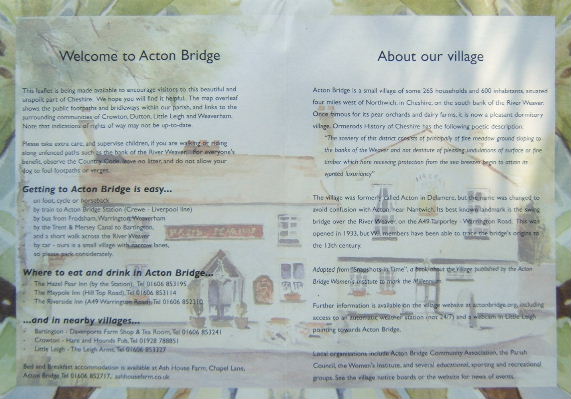 Thanks to a grant from Cheshire County Council, Acton Bridge Parish Council has produced a map of the footpaths and bridleways within Acton Bridge, together with some linking paths in neighbouring parishes. These are being made available free of charge through local outlets such as the pubs and shops in the neighbourhood.