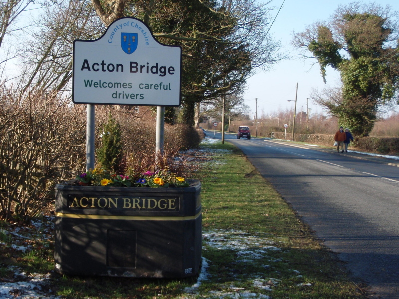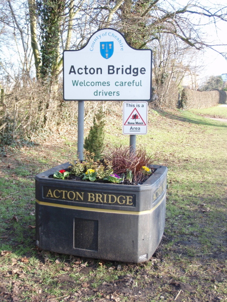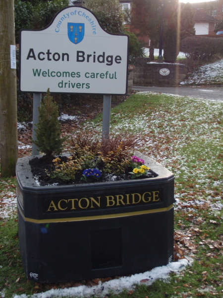 Acton Bridge Community Association has installed three planters at the entrances to the village. They were supplied by Vale Royal Borough Council, under a Licence from Cheshire County Council. The plants were bought using a grant from Cheshire Year of Gardens, and the gardening is being maintained by volunteers from the village, as the seasons change.