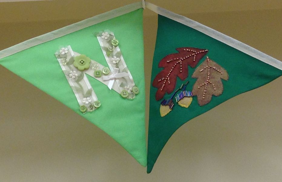 The Acton Bridge bunting above the Art section. Can you spot the caterpillars, butterfly, and rabbit?