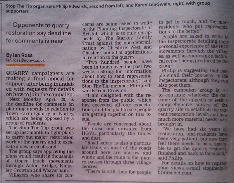 This page of the Acton Bridge website discusses the developments at Town Farm Quarry, Crowton, with material from the "Stop the Tip" campaign to oppose thousands of HGV movements through Acton Bridge and our neighbouring villages.