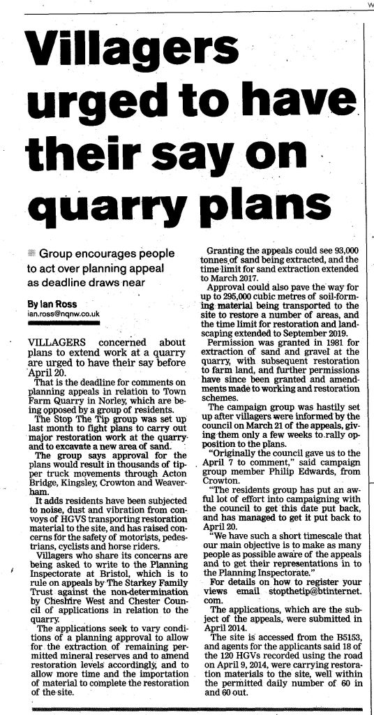 A residents' group set up in March 2015 to oppose recent proposals to carry out major restoration work and to exploit new areas of sand excavation at the former quarry at Town Farm, Norley. If approved this will result in thousands of tipper trucks movements though the villages of Acton Bridge, Kingsley, Crowton and Weaverham.