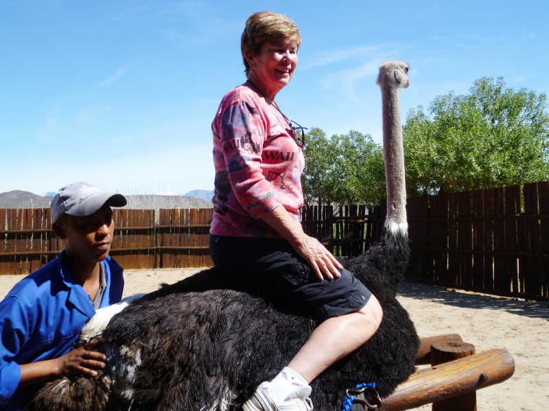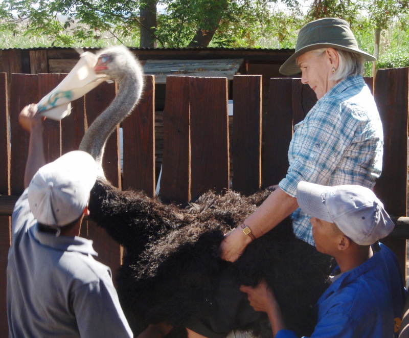 Judy riding an ostrich (not the same one!) at the Safari Farm, Oudtshoorn
