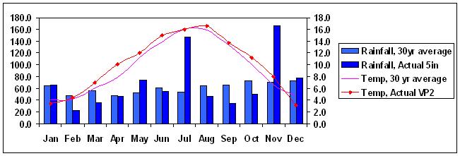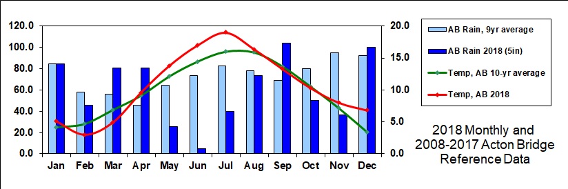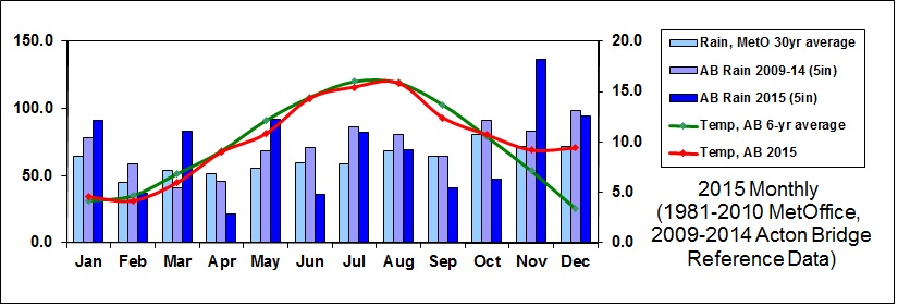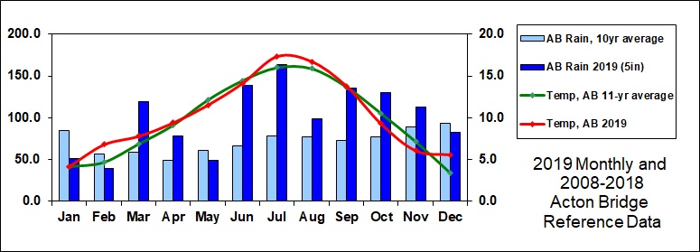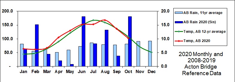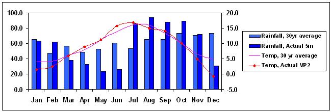 This page carries a chart of monthly rainfall and average temperature during the year to date, the current year's commentary, and data for previous years at the Acton Bridge weather station. Actual rainfall is from a 5-inch gauge, whereas the temperature record is from the Davis VP2.