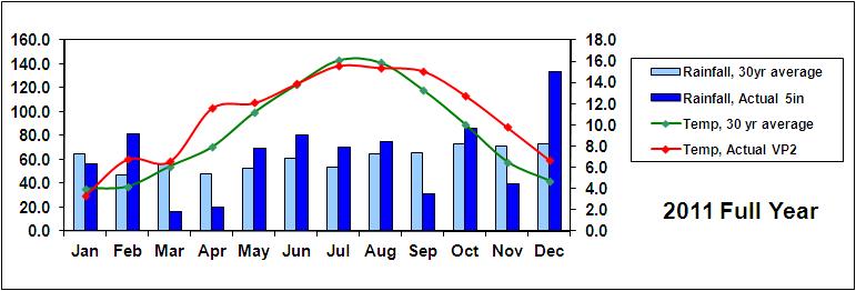 Mean Temperature was 10.8°C (1.2°C above the 9.6°C 30-year average). January, July and August were slightly cooler than average, but every other month was above average, especially April (+3.7°), October (+2.7°) and November (+3.3°).