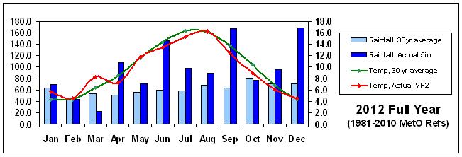 Rainfall (5" gauge) was 1,156mm (172% of the 744mm 30-year Met Office 1981 to 2010 average. The months of April, June, September and December 2012 were exceptionally wet, and the Met Office reported in late December that 2012 had been the wettest year for England since records began.