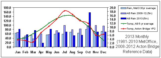 The Chart above shows temperatures (red) at Acton Bridge each month during 2013, compared with our own 5-year 2008-2012 averages (green); and monthly rainfall at Acton Bridge (dark blue), compared with our own 5-year 2008-2012 rainfall readings (mauve) and the Met Office 30-year 1981-2010 averages for Shawbury and Manchester (light blue). Our own 5-year temperature readings are so similar to the MetOffice ones that the latter have been omitted for clarity.