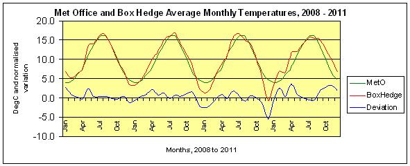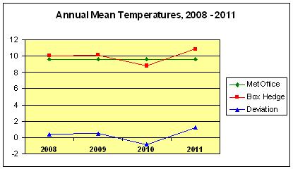 The following charts show the last four years' monthly and annual temperatures plotted (red) against the (repeating) Met Office averages (green), with our recorded deviation from average plotted in blue to the same scale.
