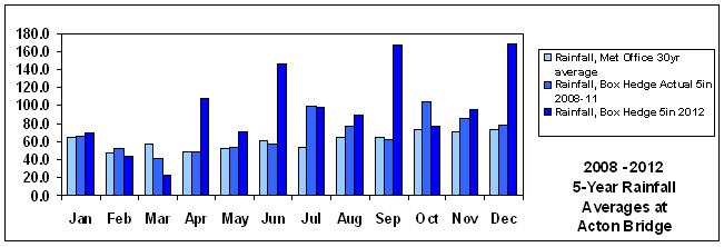 The Chart shows three rainfall series - lightest blue is the Met Office 30-year averages for Shawbury and Manchester ; the mid-blue is the four-year 2008-2011 averages for the Acton Bridge 5" rain gauge ; and the darkest blue is the 2012 monthly rainfall. The months of April, June, September and December 2012 were exceptionally wet, by either standard. The Met Office reported in late December that 2012 had been the wettest year for England since records began.