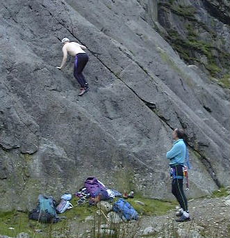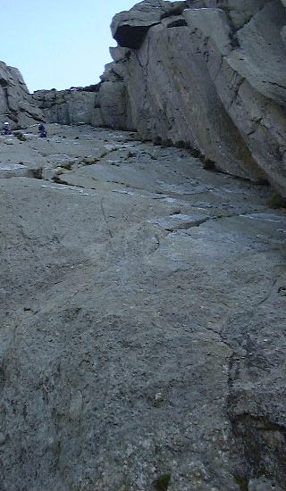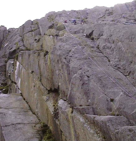 The Slab on the Gribin Facet : you can see this area in the centre of the foreground crag at the top of the page. Slab Direct Route (VDiff) goes straight up a thin crack, just visible in the upper section, parallel with the right hand wall. Steve led this, Marek seconded