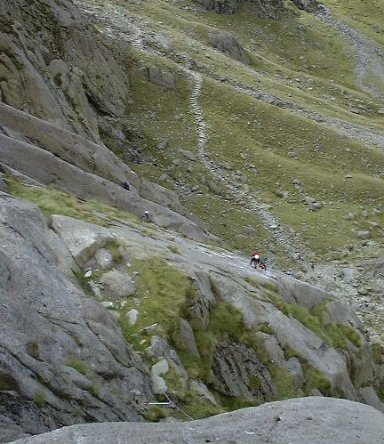Leaving the Idwal Slabs: Tennis Shoe follows the obvious sunlit ramp at lower left